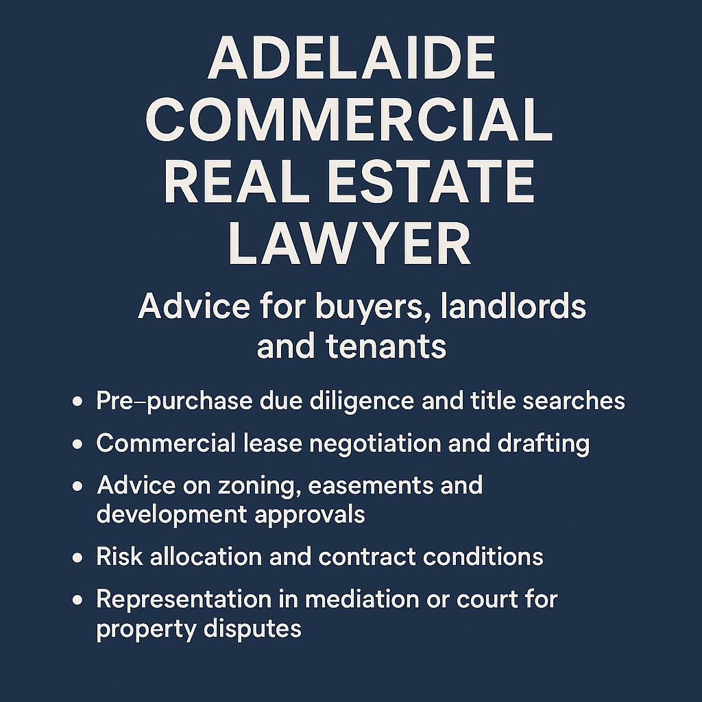 Whether you need a commercial lease lawyer in Adelaide, a commercial property lawyer Adelaide trusts for sales, or representation in a building dispute, local knowledge matters. See our Commercial Lease Lawyer Adelaide service for lease-specific support: commercial lease lawyer Adelaide.